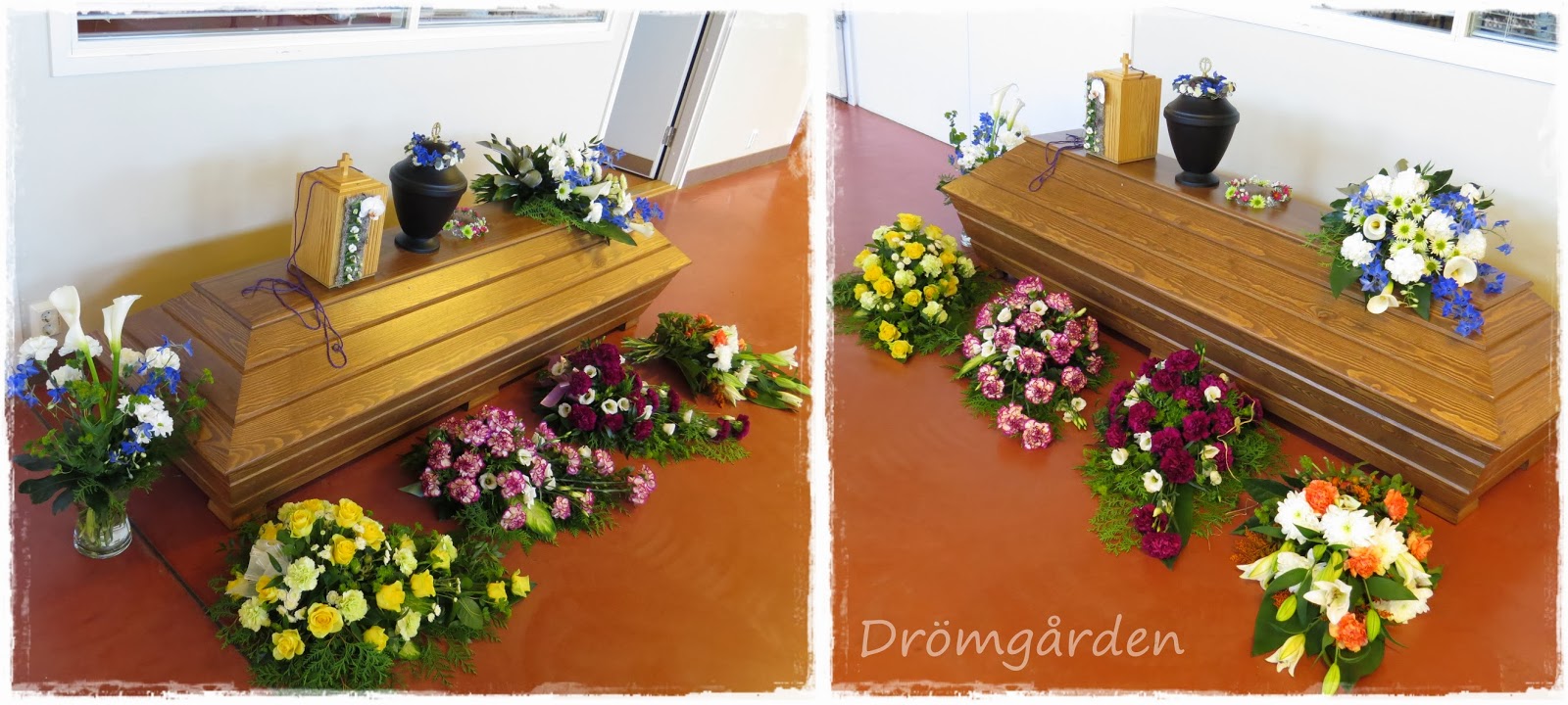 När vi var klara, placerat arrangemanget på kistan och fått våran feedback så prövade vi även att placera kistdekorationen på det ljusare locket. Detta gjordes för att man skulle se skillnaden hur färgerna går ihop beroende på kistans färg. Vårat arrangemang passade även på den ljusa, men färgerna smälte aningen in i varandra och det blev lite blekt.
