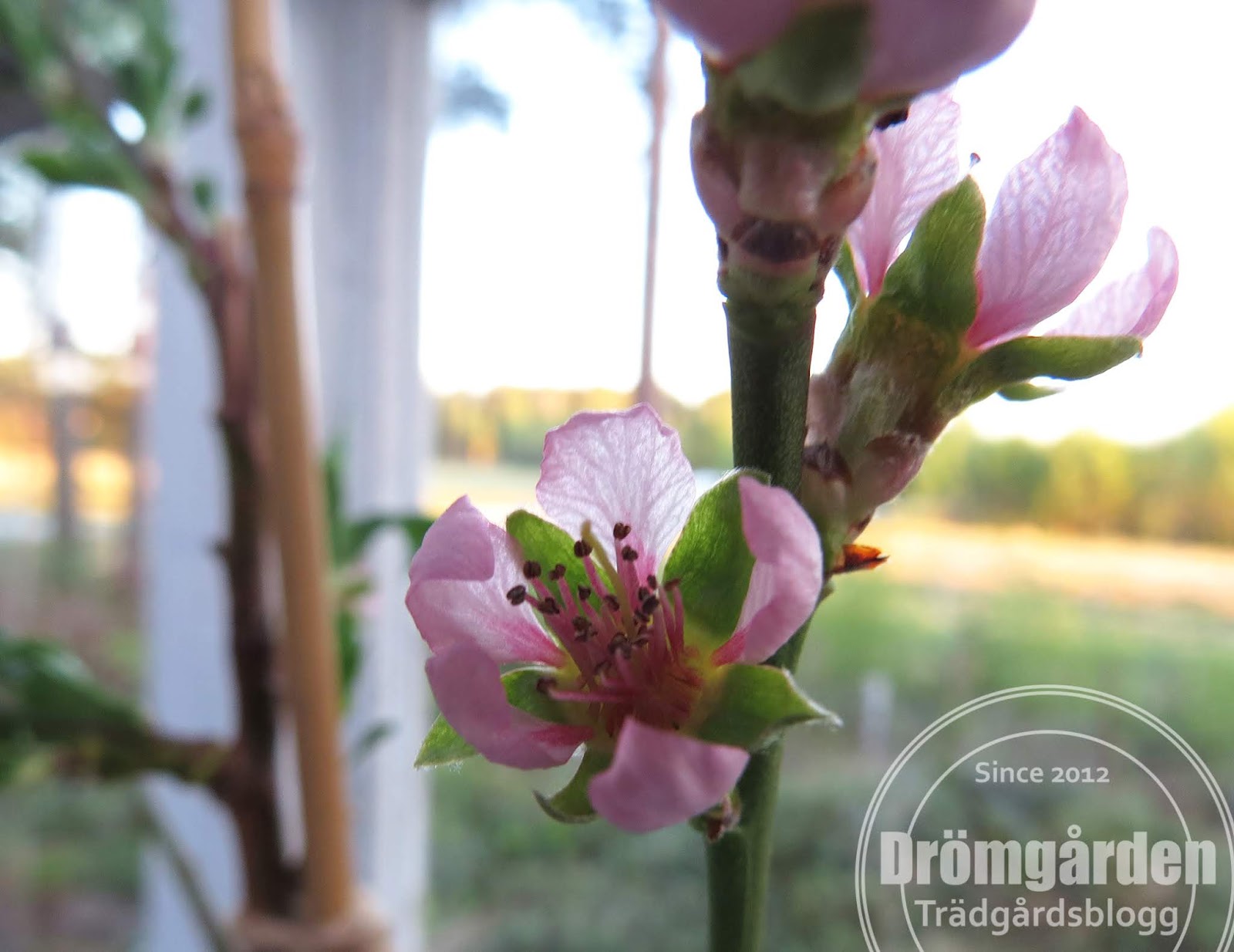 | Persika 'Fruit me yellow' i blom inne i växthuset |